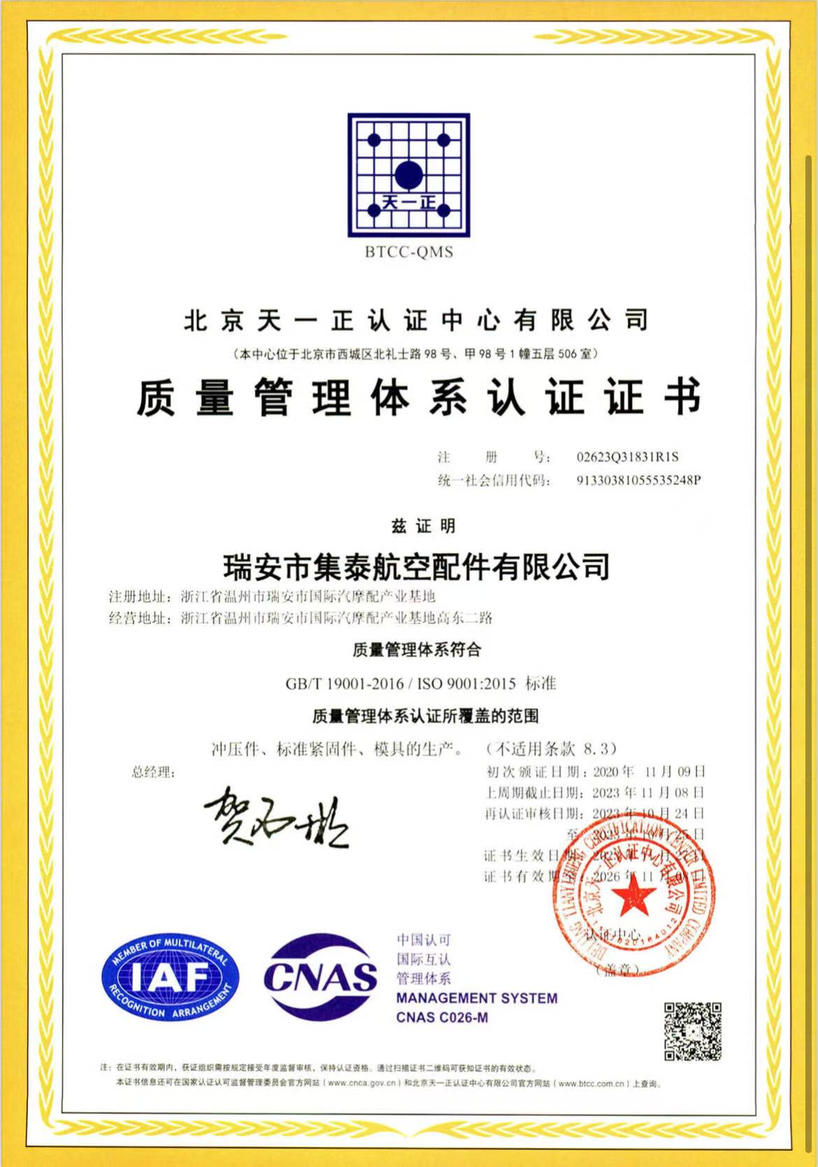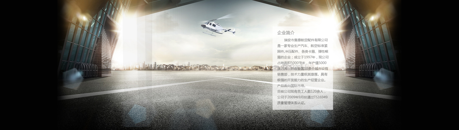 瑞安市集泰航空配件有限公司,原是(温州富泰汽配有限公司)成立于1989年,是一家专业生产汽车、摩托车、航空配件及铝造型配件的企业,占地面积4800平方米,总资产5000多万元。公司有员工100多人,专业的技术人员和管理人员20人,技术力量及其雄厚,具有极强的开发能力;有专业的生产设备80台,配备各种专业的检测、实验设备的检测中心一个;产品面向国际和国内市场,公司在全国30多个城市设有销售网络,并与国内知名汽车主机厂昌河航空工业公司、昌河铃木、长安、长丰、广汽等形成稳定的军品民品配套关系,市场份额逐年扩大,公司于2002年5月通过IS09001; 2000质量管理体系认证,在2009年10月通过 IS0/TS16949;2002认证,在管理上已同现代企业管理制度接轨。
